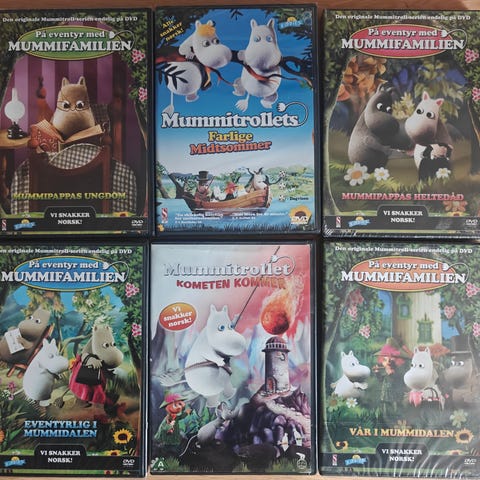 Selger en samling med 6 Mummitrollet-filmer på DVD. Fine familie- og barnefilmer med norsk tale. Perfekt for Mummi-fans og for koselige filmkvelder.