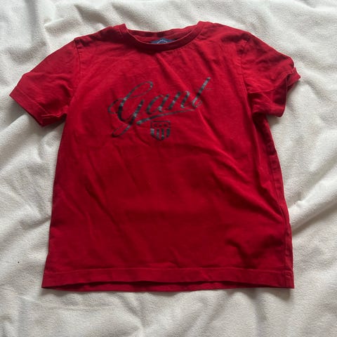 GANT skjorte i blå/hvitsteipete for gutt, størrelse 122/128. Skjorten har knappelukking foran og er designet for barn i alderen 7-8 år.