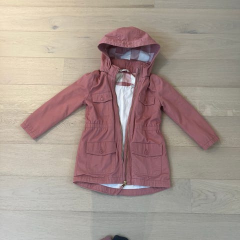 Zara jakke for barn i størrelse 122, designet for jenter. Jakken er rosa og laget av bomull. Den har hette og glidelås foran, med et mykt fleecefôr på innsiden for ekstra komfort.