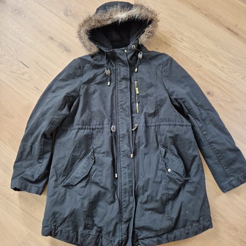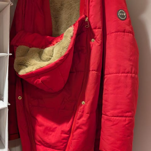Jakke som kan brukes når man skal bære barnet. Kan også ta av den ekstradelen foran å brukes som vanlig jakke. Pelsen på hetten kan også tas av.