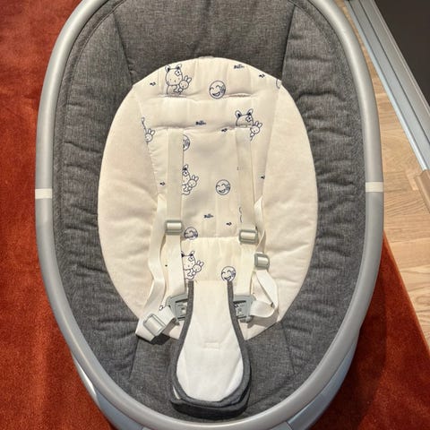 Fisher-Price barnesitter med integrerte leker og musikkfunksjon. Barnesitteren har en polstret sittepute i beige og brun med sikkerhetssele. Den har en lekearm med myke leker og en kontrollpanel for musikk og vibrasjon. Egnet for spedbarn og småbarn for komfort og underholdning.