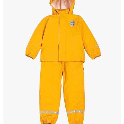 Et regnsett til barn som lyser opp på grå dager. Laget i resirkulerte fibre.