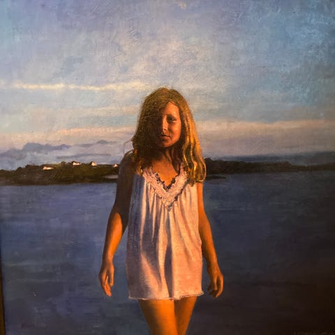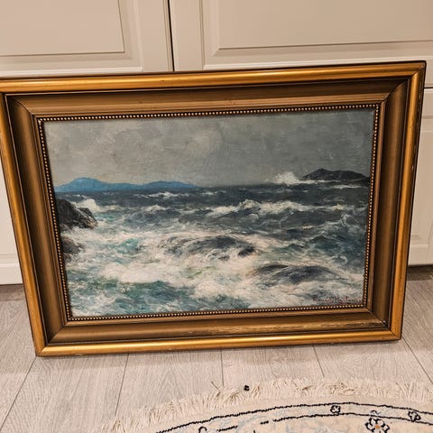 Dora Maleri bilde som viser båter på vannet i varme farger. Bildet er innrammet med en svart ramme. Motivets dimensjoner og materialer er ikke oppgitt.