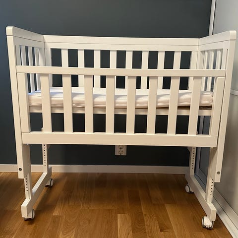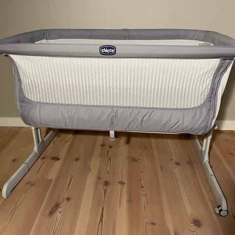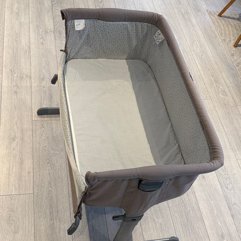 Chicco next2me bedside crib designet for plassering ved siden av voksenes seng. Laget med myke materialer og nettingvinduer for god ventilasjon og oversikt. Justerbare ben for stabilitet og enkel tilgang til barnet. Kant kan vippes ned, se bilde. Madrass brukt av et barn i 7 mnd.