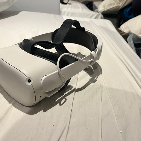 Oculus/Meta Quest 2 med 128gb med lagringsplass, og fem meter lang ladekabel.