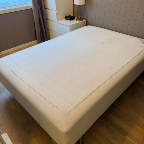 Godt brukt seng.Følger med en lang kasseskuff under sengen. Følger også med madrass og overmadrass. Er montert fra hverandre.