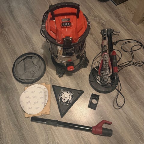 Tak- og veggsliper (giraff) og støvsuger fra biltema med ekstra pussepapir og støvsugerposer. Giraffsliperen kjøpte jeg brukt her på Finn og støvsugeren er ny. Begge fungerer helt fint og er uvurderlige om du skal sparkle tak eller vegger, som jeg nå er ferdig med. De er litt støvete, men i god stand og alle deler medfølger. Pussepapirene som følger med er alene verdt rundt tusenlappen, tror jeg. Giraffsliperen kommer med originalembalasjen sin.