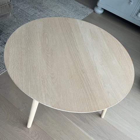Rundt sofabord sett i sort eikefiner og sorte stålben.
