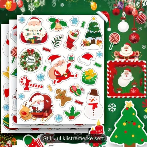 Juledekorasjon transparent klistremerker med forskjellige motiver som snømenn, nisse, dyr og snøfnugg. Egnet for dekorasjon i vinter- og julehøytiden. Fargerike og detaljrike design.