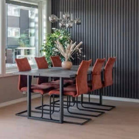 Pene komfortable og stilrene stoler kordfløyelstoff med svarte ben i metall.