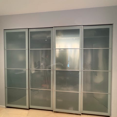 Selger disse skyvedørene til pax pga flytting. Skinner til skapene følger også med hvis ma ønsker!