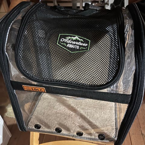 😻Bærbart kjæledyrbur med metallgitterdør. Inkluderer to metallskåler, en hvit plastskål og en svart plastskål. I tillegg følger ei hjertekurv med et mykt, brunt kjæledyrteppe med poteavtrykk i blått og svart. +Ei grå silikonmatte for å ha under matskålene. Sum for alt kr 190,-