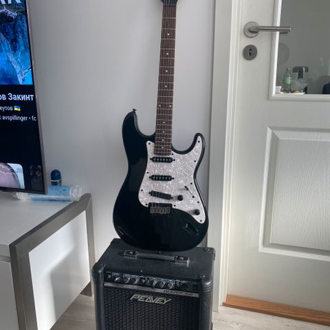 Cort el-gitar, nylig justert med nye strenger, og tilhørende forsterker på 20w, selges samlet. Strømforsyning og gitarreim følger med, men ikke stativet. Veldig god stand, så å si ubrukt!