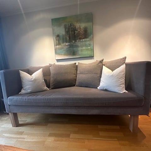 Spisestuesofa selges pga. flytting. Utrolig behagelig å bruke både til spisestuesofa og til å slappe av i. Godt brukt og har noen flekker etter bruk, men trekket kan vaskes på 30 grader. Mye god bruk igjen i denne solide sofaen!