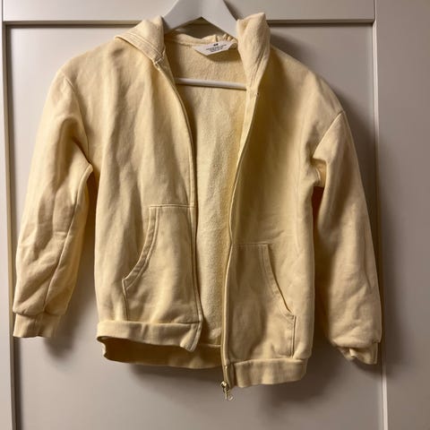 H&M hettegenser i størrelse 134. Genseren er blå med hvite striper og laget av 100 % bomull. Den har hette og lange ermer.