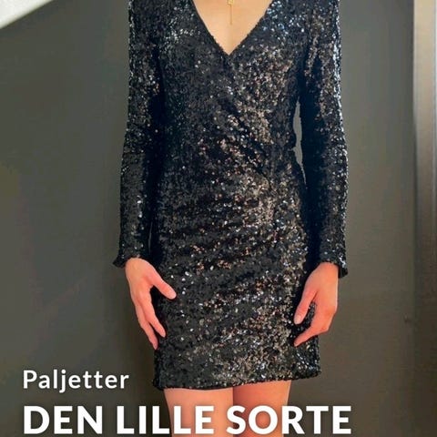 Nydelig sort kjole med glitrende paljetter. Kjolen har dyp V-hals, lange ermer og flatterende passform som sitter pent i midjen før den faller elegant ned. Mykt og behagelig stoff, til tross for paljettene.