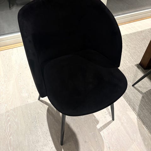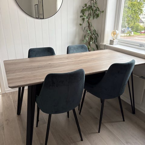 Jysk spisestoler selges i pen grønn velour.