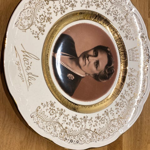 Kongelig minnetallerken produsert av Figgjo Flint på 1950-tallet, med portrett av kronprinsesse Märtha.