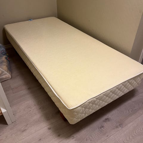 Den har to merker der det ble sølt vann på men den er veldig konfortabel.vi har også over madrass til den