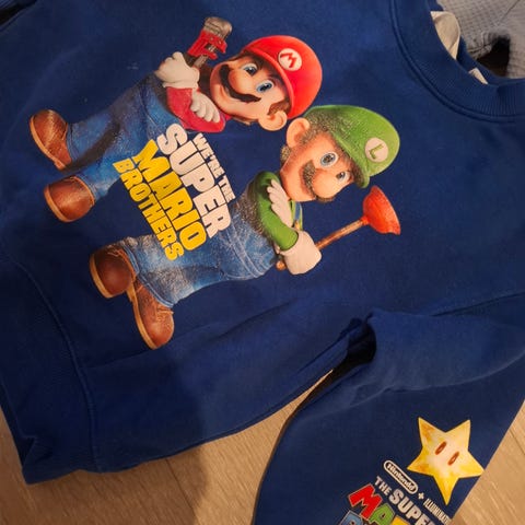 Romslig i størrelsen. Vasket med Milo. Lite merke på ene ermet.