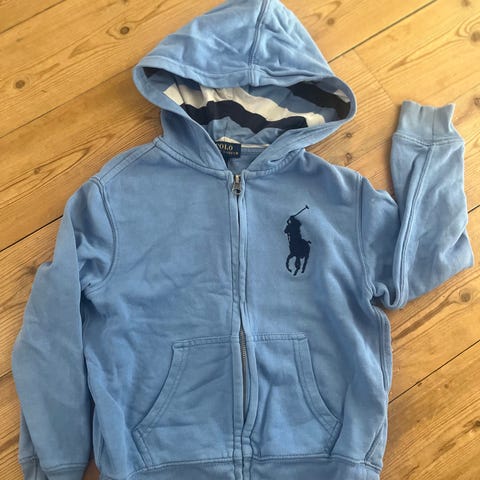 Polo Ralph Lauren hettejakke i blå farge med grå ermer. Jakken er av 87% bomull og har glidelås foran og ribbestrikkede mansjetter og kant med røde striper. Noe slitasje på mansjettene.
