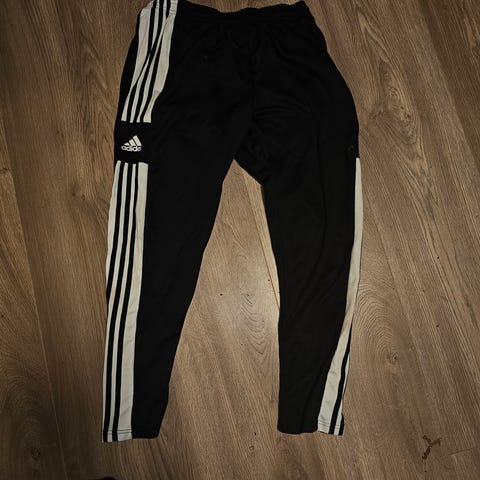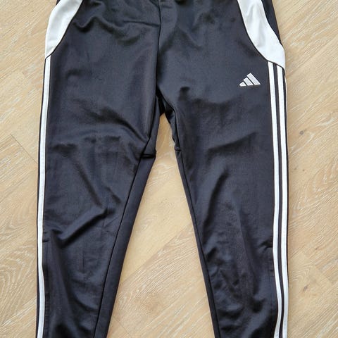 Adidas fotballbukse i størrelse L for unisex. Buksen er svart med hvite striper langs sidene og har elastisk midje.