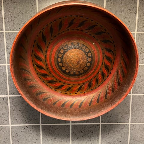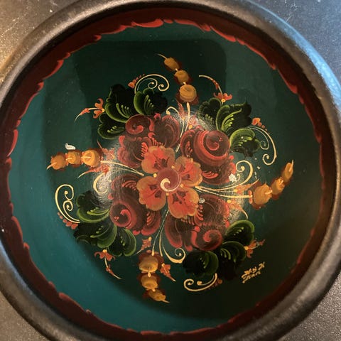 Håndmalt trebolle, rosemaling, norsk folkekunst, vintage trearbeid, dekorative boller, skandinavisk design, retro interiør, håndverk, trekunst
