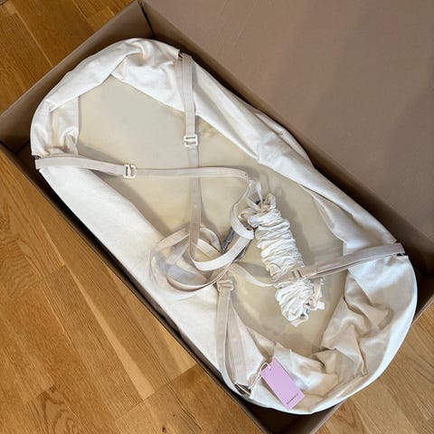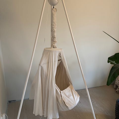 Moonboon slyngevugge med stillegående motor (2.0) i fargen nature. Følger med stativ, madrassbeskytter, laken, i tillegg til sengehimmel og karmbeslag som gjør at den er enkel å ha med seg på reise (uten stativet). Pent brukt, brukt med madrassebeskytter for å unngå flekker.