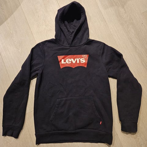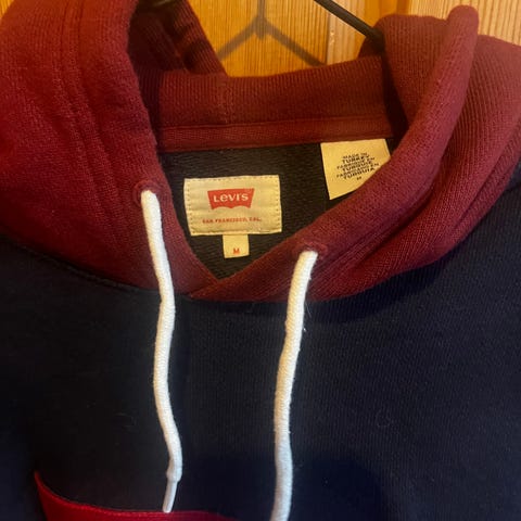 Levi's genser i flerfarget bomull, størrelse M for herre. Genseren har hette med snor og frontlogo. Materialet er bomull, egnet for hverdagsbruk.