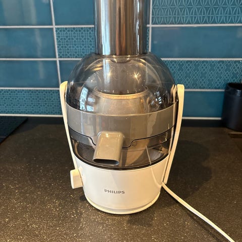Selger en Philips juicepresse i god og fullt fungerende stand. Kraftig og kompakt modell, perfekt for fersk juice av frukt og grønnsaker.