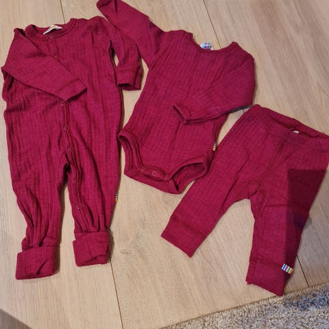 Klær i størrelse 56 fra Reflex, en grønn bukse i merinoull og bambus, en grønn omslagsbody i bomull og en oransje tynn heldress i bambus. Bambus kjennes ekstra myk på ny babyhud.