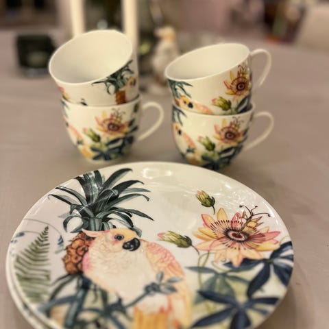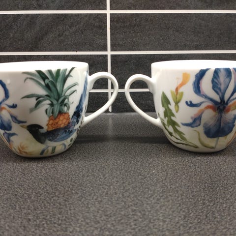 To kopper fra den skjønne serien " Florytale cockatoo " til Magnor. Disse kommer uten skål og er en slags krus/ kopp kombo. Høyde 8 cm, rommer 3dl fulle. Begge krus er feilfrie og dekoren er som ny.