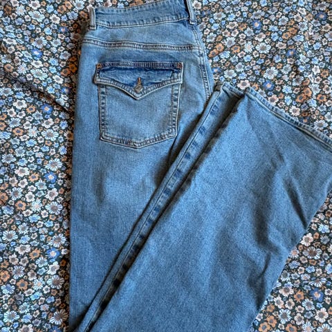 Kjempesøte jeans, flare. Brukes desverre lite. I god stand, lite slitt nederst itillegg. Tror de er str. 36, passer hvertfall en S. Lengre lommer foran.