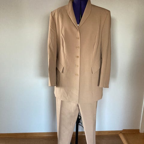 Klassisk marineblå dress fra Gerry Weber, str. 48 i fin ullblanding. Lett svinget jakke med skulderputer og lommer i sidene. Bukse med linning og lommer. Størrelse 48