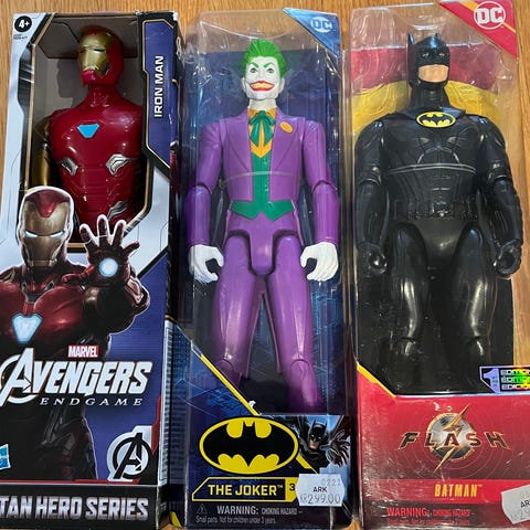 Actionfigur av The Joker iført lilla dress med grønn vest og oransje slips. Figuren har grønt hår og hvitt ansikt med karakteristisk smil. Egnet som samlerobjekt eller lek.