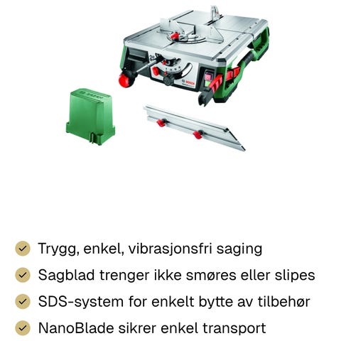 Bosch PTS 10 bordrundsag med justerbare innstillinger for høyde og vinkel. Egnet for presisjonskutting av tre og andre materialer. Kompakt design med stødig stativ for stabil bruk.
