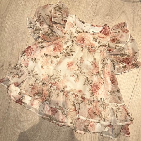 Kjolen er lys, dus grønn med roser på. Volanger på overdel og blonde nederst på skjørtet.