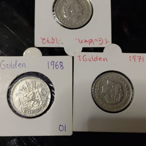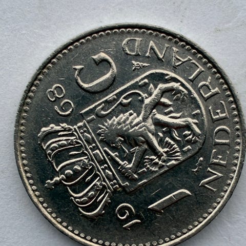 Nederland 1 Gulden mynt fra 1956 med motiv av dronning Juliana på forsiden og riksvåpenet på baksiden.