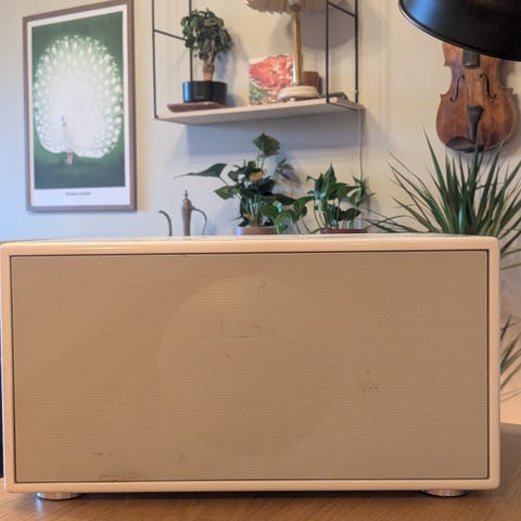 Geneva acustica høyttaler med sort gitterfront. Produktet har et minimalistisk design og er laget av materialer som gir god lydkvalitet.