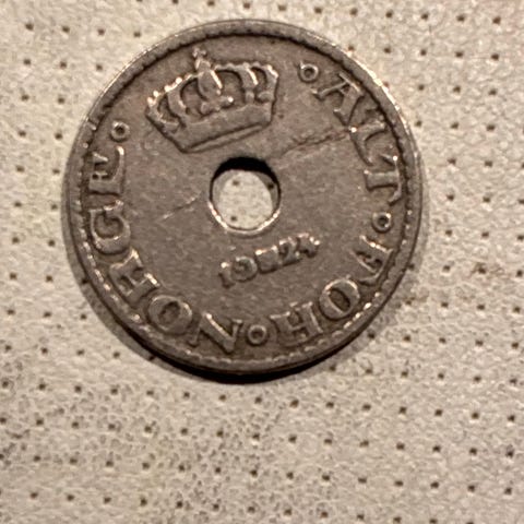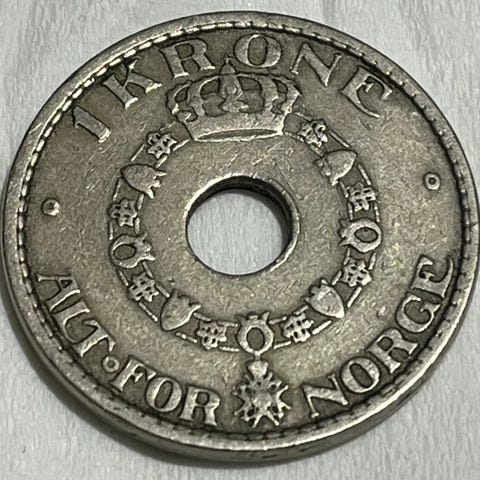 Norsk 1 krone mynt fra 1925 med hull i midten. Mynten har tradisjonelt design med kongelig monogram og årstall. Laget i metall, brukt som valuta i Norge.