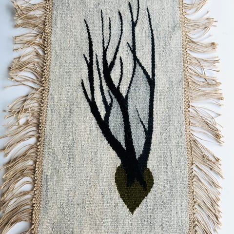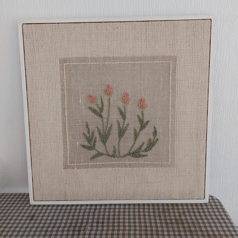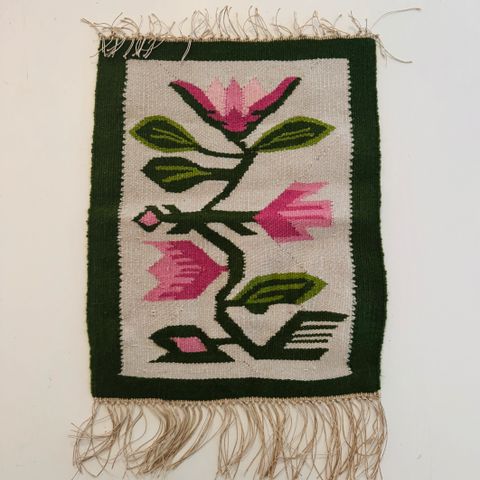 Håndvevet billedvev 19 x21,5 cm. Blomst i to rødfarger med grønne blader og stilk. Lys, melert bakgrunn. Vevet med ull på selve blomsten og blanding av ull og lin på den lyse bakgrunnen. Eget design. One-of-a-kind, ingen har maken.