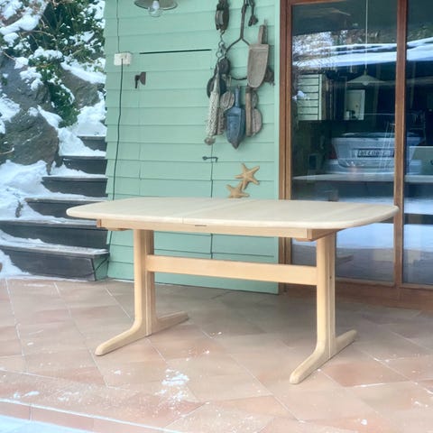 Flott spisebord fra Skovby Møbler, utført i heltre bøk. Minimalistiske og klassiske linjer. Bordet er pusset ned og behandlet med olje. Dog er det et sjenerende merke på enden av bordet. Kun kosmetisk - ikke noe av praktisk betydning. Selges derfor til svært gunstig pris. Følger med 2 plater som kan lagres i bordet.