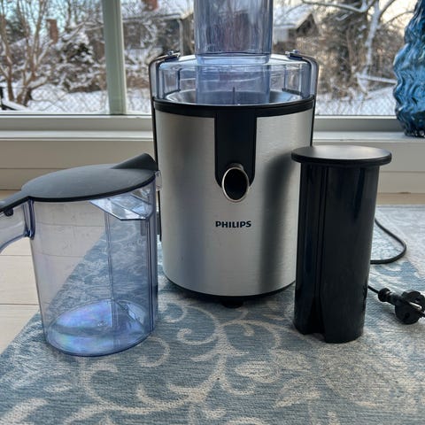 Philips HR1855 juicepresse i rustfritt stål med svart plast. Modellen har en kompakt design med integrert sil og hendel for enkel bruk. Egnet for å presse juice fra frukt og grønnsaker.