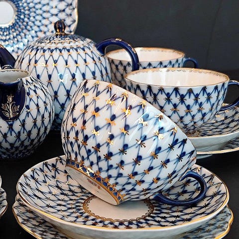 Serviset er håndlaget og håndmalt på porcelensfabrikken i St. Petersburg under USSR-tiden, dekorert med praktfullt 24-karat gull.