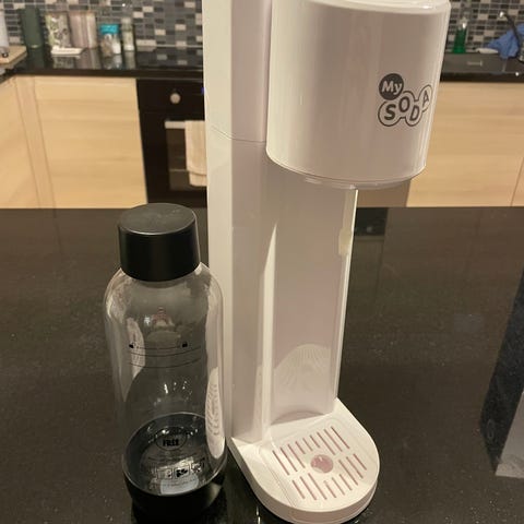 IKEA MySODA brusmaskin i hvit farge. En kjøkkenmaskin for å lage kullsyreholdig vann hjemme.
