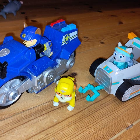 Samling av Paw Patrol figurer og kjøretøy i ulike farger og størrelser. Inkluderer flere karakterer og kjøretøy fra serien, laget i plastmateriale, samt noen kosedyr.
