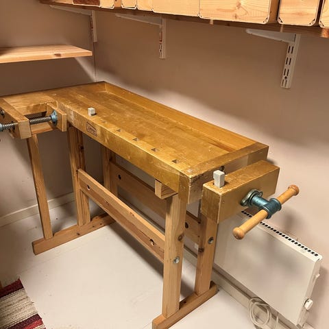 Hamran Arbeidsbenk i tre med skrustikke. Passer til ulike håndverksoppgaver og hobbyarbeid. Solid konstruksjon i naturlig tre. Helt ny, kun satt opp. 119 cm lang. Vurderes å selges.