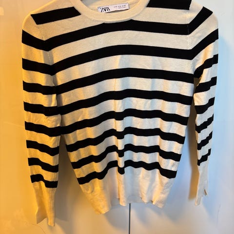 Zara genser størrelse M, fargen hvit, laget av viskose. T-skjorten har stripemønster og knappedetaljer på ermene. Designet for kvinner.