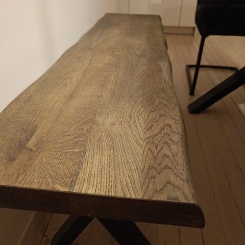4 stk. spisebordstoler i svartlakkert eikefinér. Ben er svartlakkert stål. Avtagbar filt på setet til alle 4 følger med. Sittehøyde 46 cm. Selges samlet.