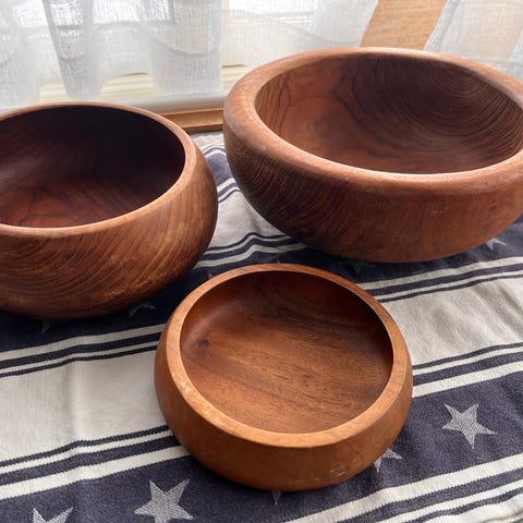 - Treskål i akasietre med håndtak i skinnimitasjon fra Feel, selges for 200,-